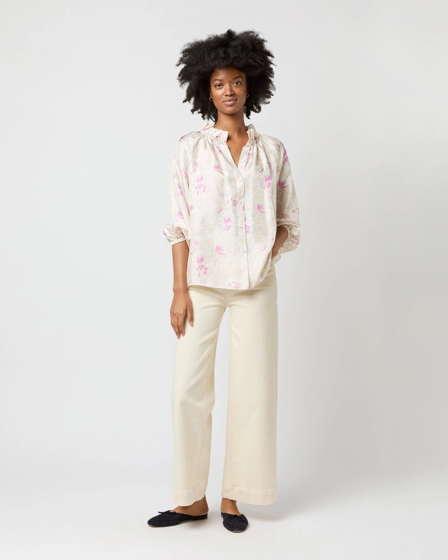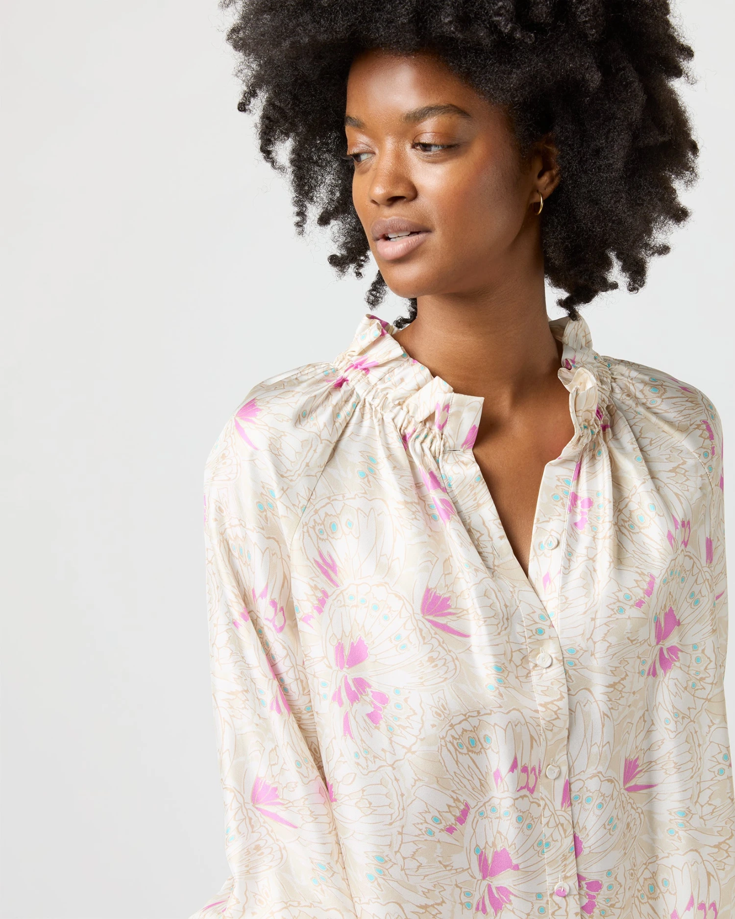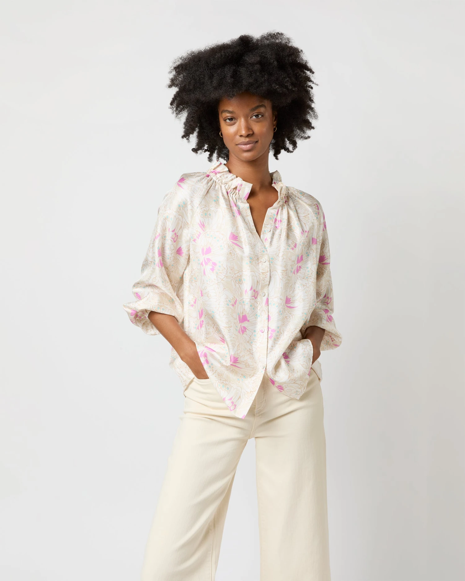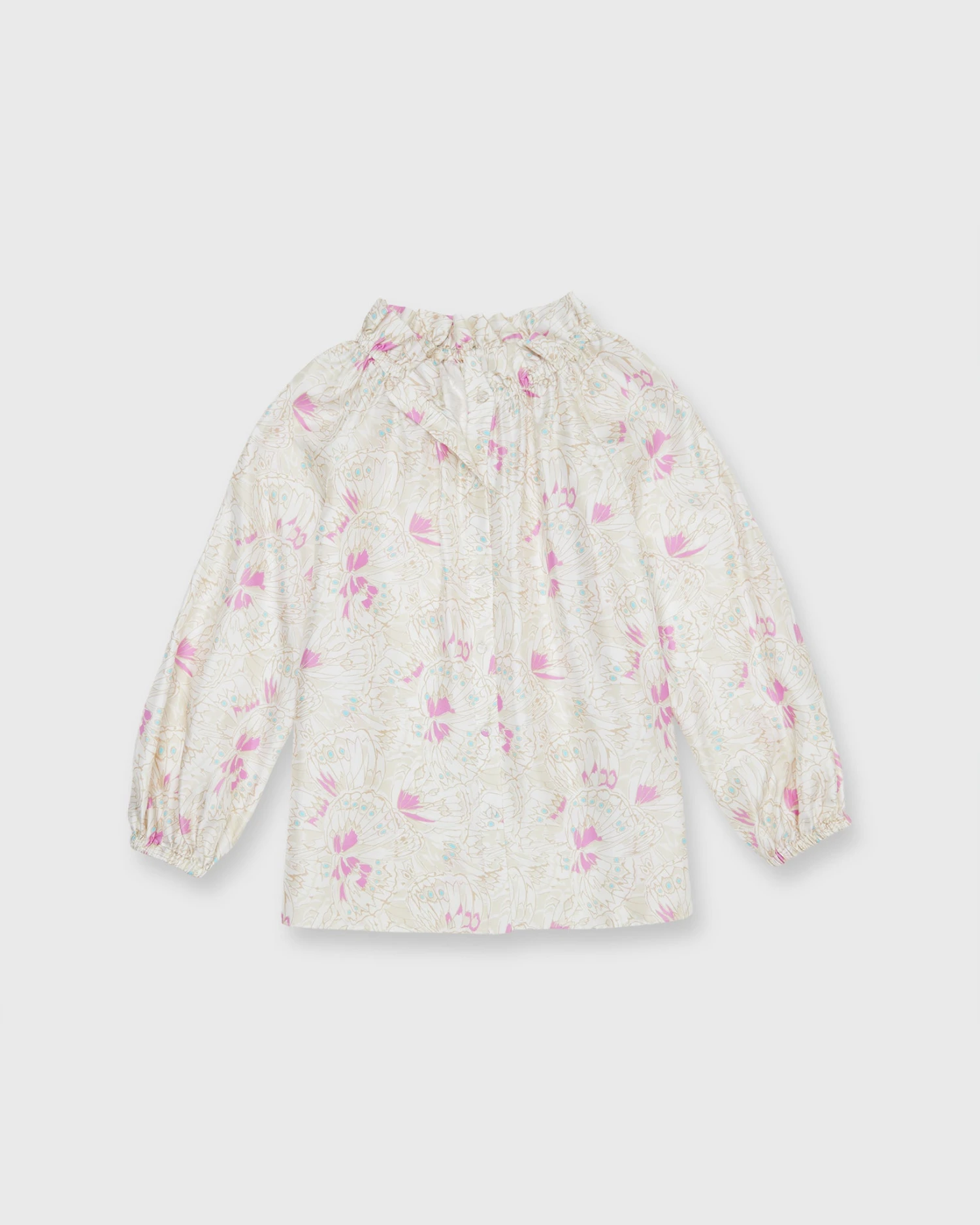 Very much a twist on a βbutton-up blouse,β this is a slightly less-sweet version of our hit Kamille shape. It’s got covered buttons down the front, plus the same elasticated neckline and wrists as the original for an easy, adjustable fit. This one’s made of silk twill from Italy with the prettiest, subtlest butterfly print.