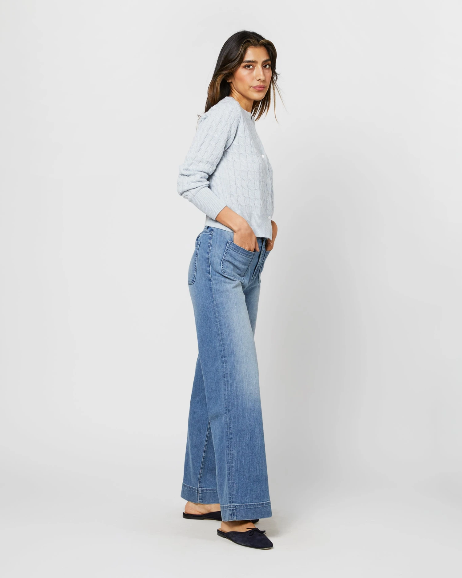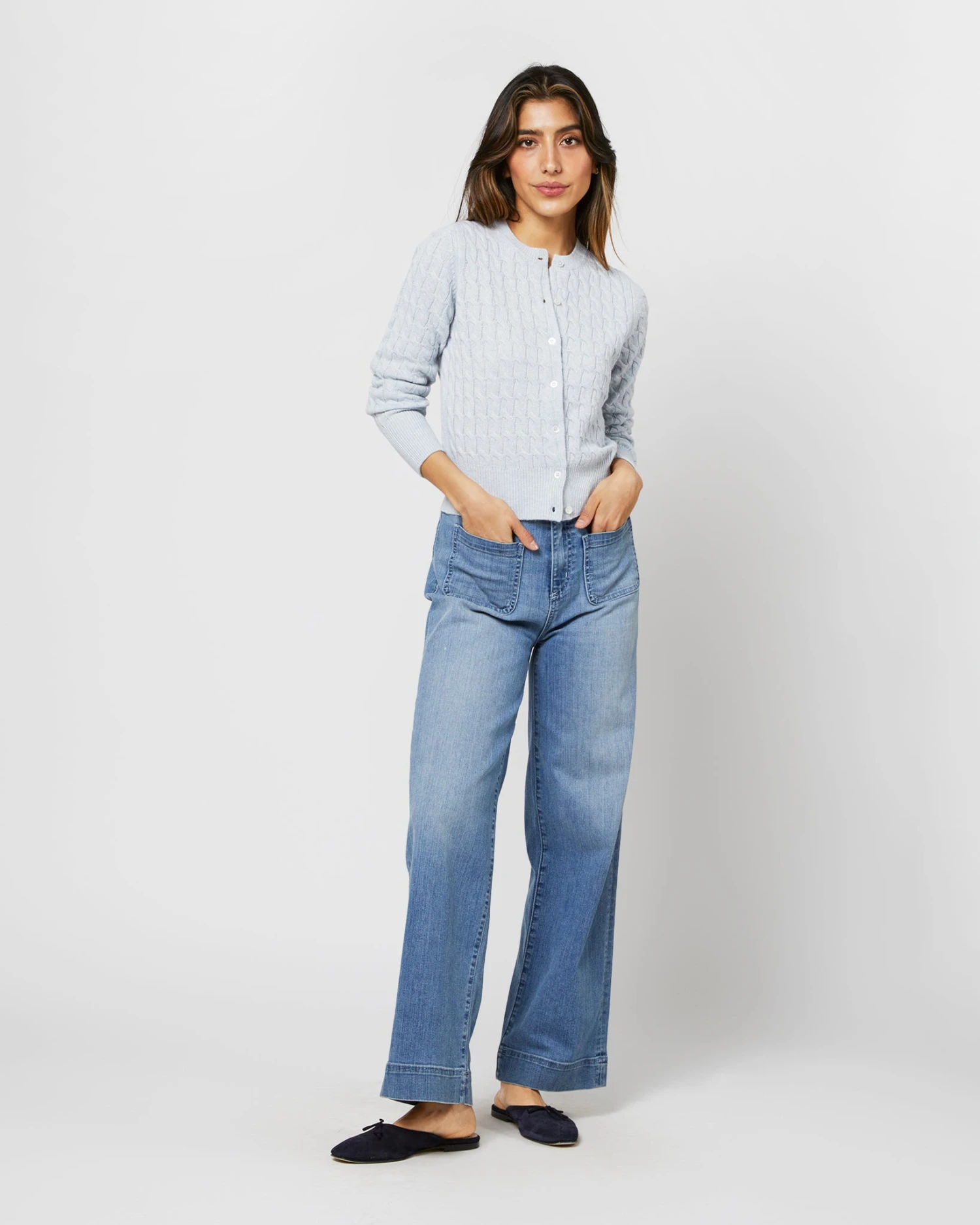 Our latest (and Annβs favorite) addition to our line-up of trim throw-on sweaters. It goes with everything β itβll even go with nothing. We love the way a cardigan looks worn as a shirt. This one is made of our go-to 4ply Mongolian cashmere with sweet, slightly nostalgic cable stitching throughout.