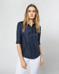 Elbow-Sleeve Frill Blouse In Navy/White Polka Dot Silk Twill