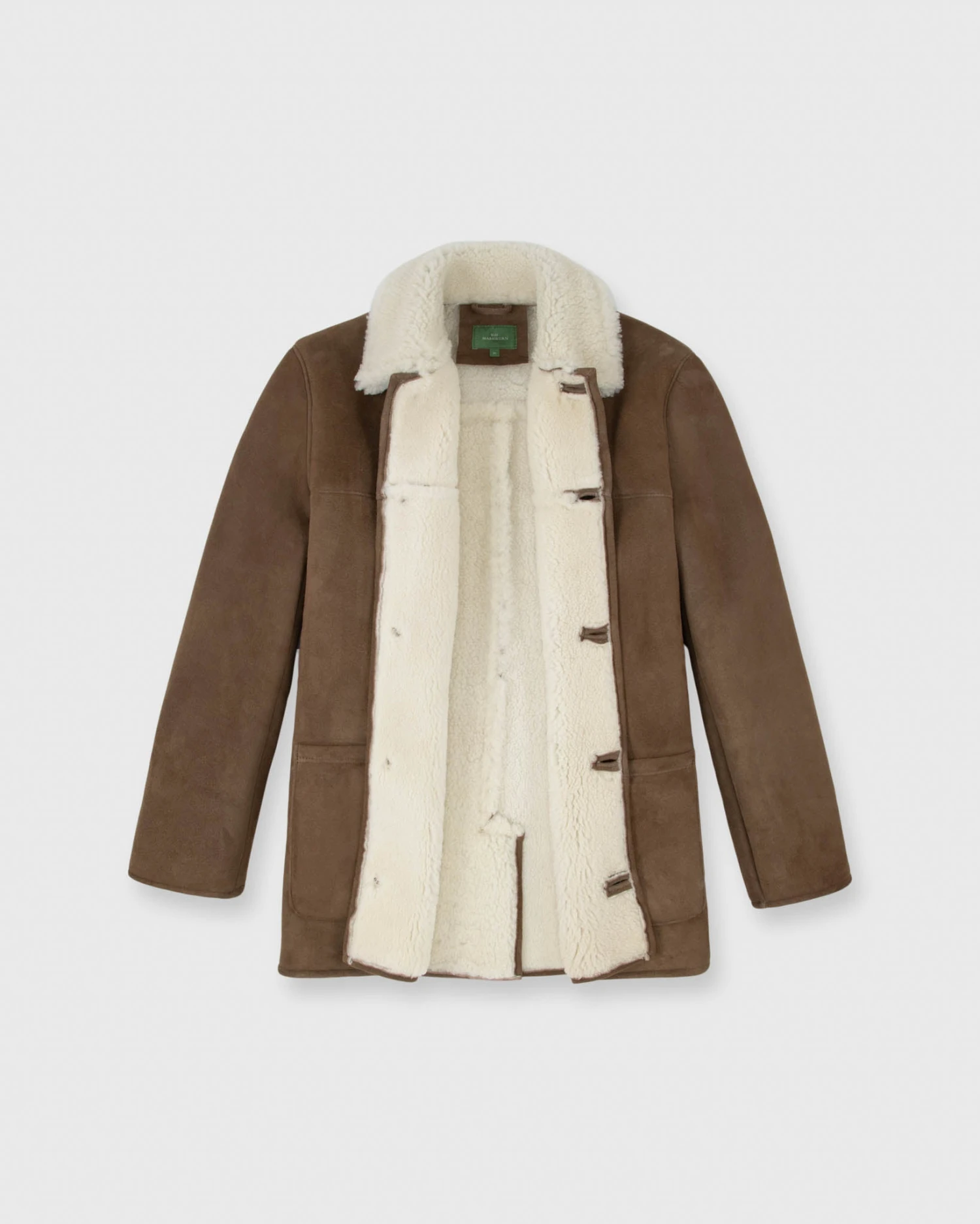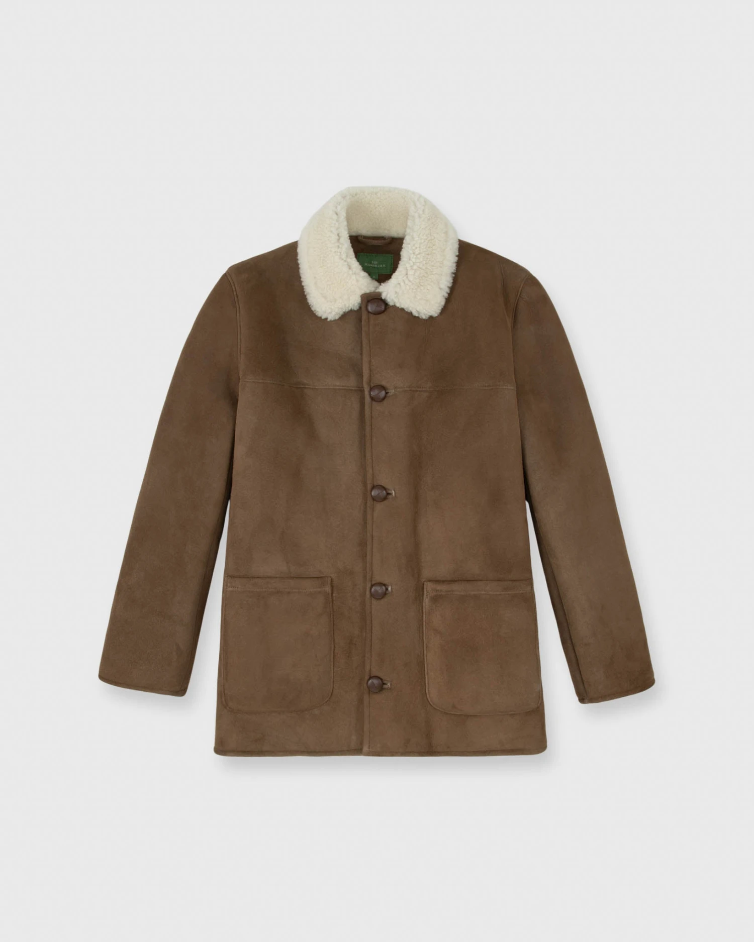 The Design team has been calling this the Steve McQueen coat… you can probably figure out why. It’s a beautiful piece of outerwear, made of rich, snuff-colored sheepskin suede with a cozy shearling lining. It’s made in England with leather-covered buttons, open patch pockets, and a back vent.