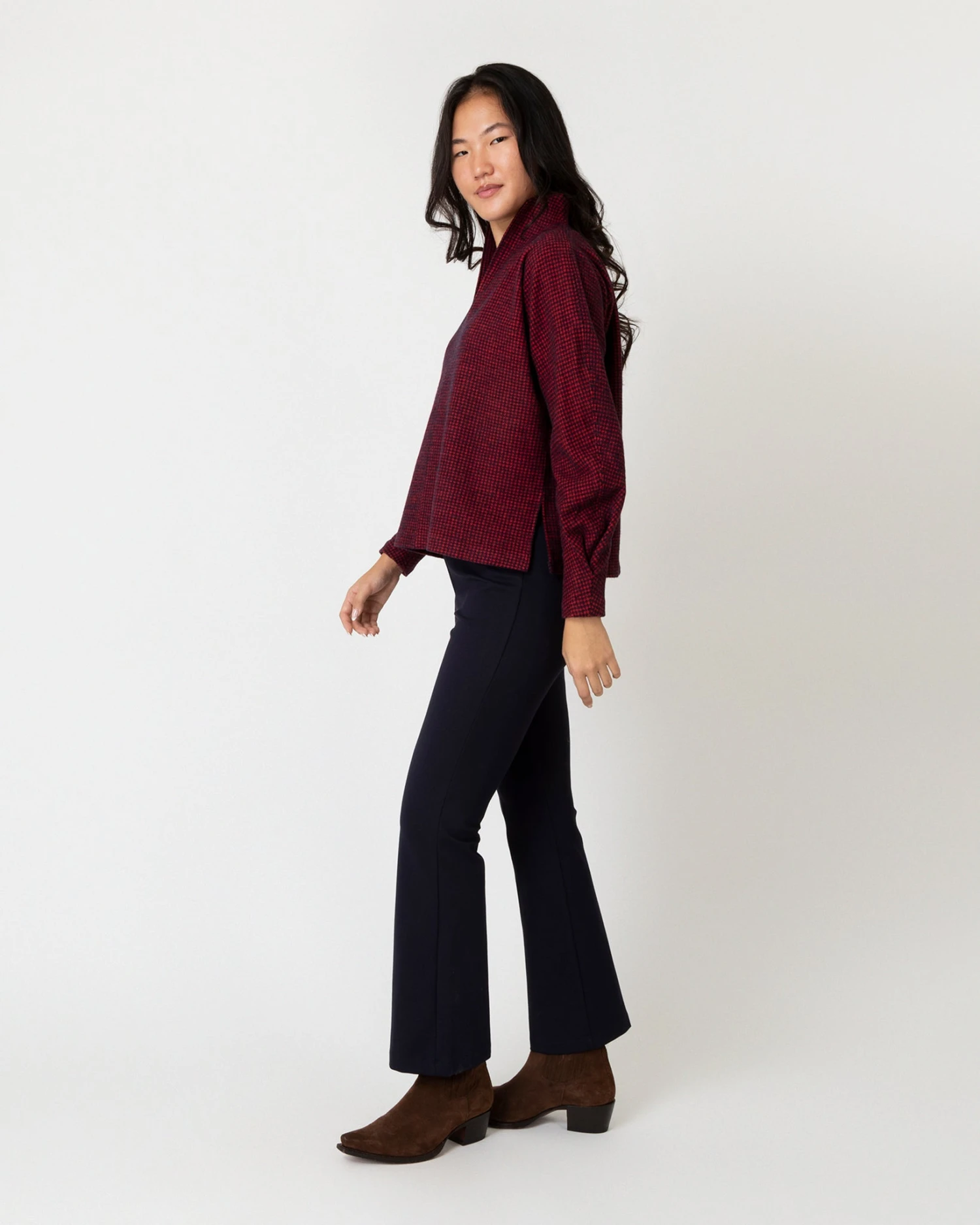 We sell out of the Violet top every time for a reason… it seems to be flattering on everyone. It’s a pretty, slightly blousy shape with a high collar, a slit neckline, and a subtle gathered sleeve detail. The material is special, too— a brushed knit wool from Northern Italy that’s luxe and cushy and hard to put into words, with a lot more “give” to it than a traditional woven wool. You just have to touch it.